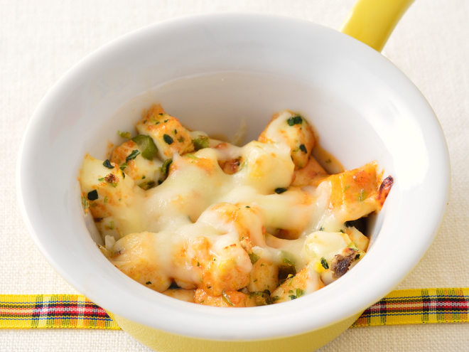 - 「手作り応援 野菜リゾットのもと」をまぶし、チーズをのせてトースターで焼きます。